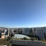 公園のベンチ、 駅前のモニュメント、 ビルの外壁、 街路樹の配置。